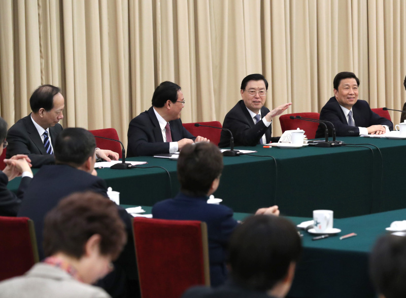 3月9日,中共中央政治局常委、全国人大常委会委员长张德江参加十二届全国人大五次会议江苏代表团的审议。新华社记者 马占成 摄