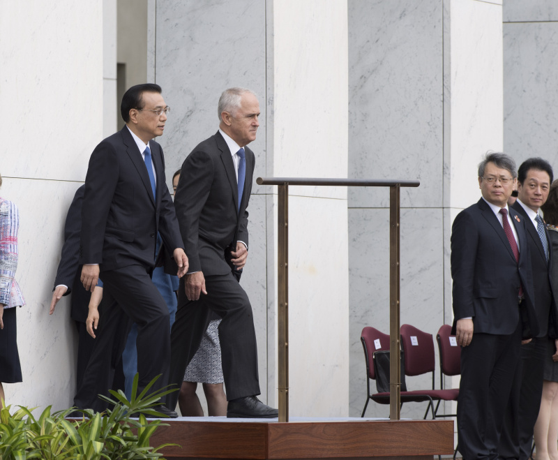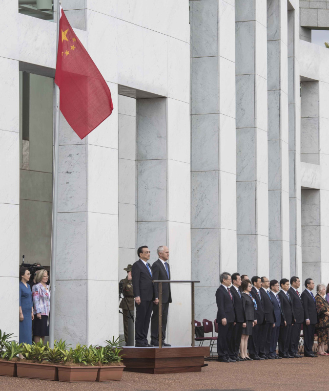 当地时间23日上午,澳大利亚总理特恩布尔在堪培拉议会大厦广场举行隆重仪式,欢迎李克强总理对澳进行正式访问。19响礼炮声中,特恩布尔夫妇在下车处迎接李克强夫妇。广场上奏响中国国歌,李克强检阅了仪仗队。两国总理登上检阅台后,军乐团再次奏响中澳两国国歌。